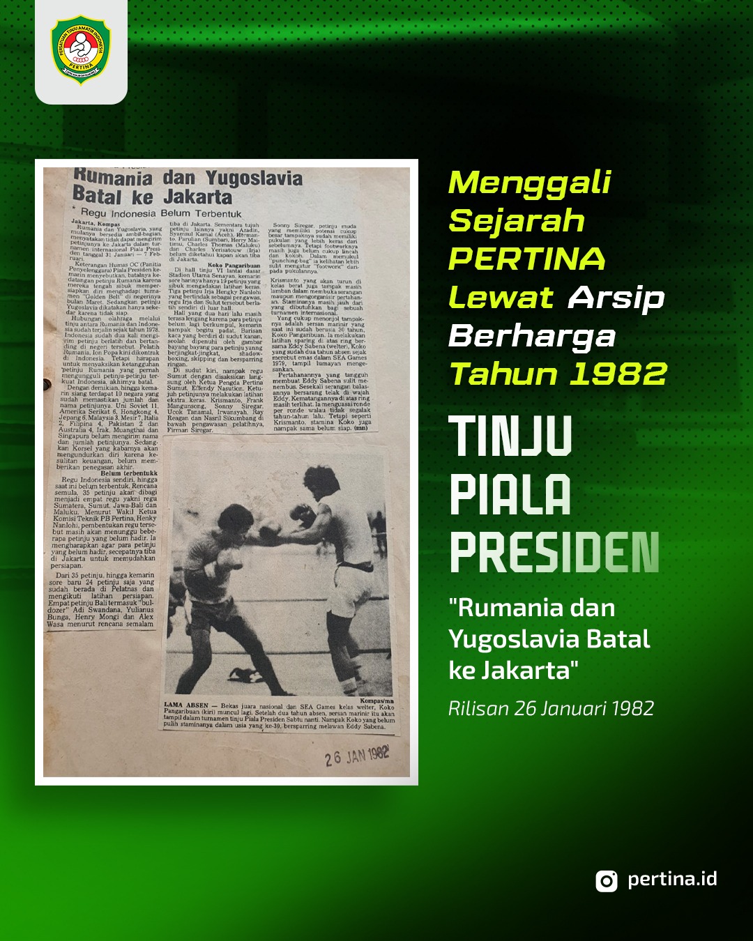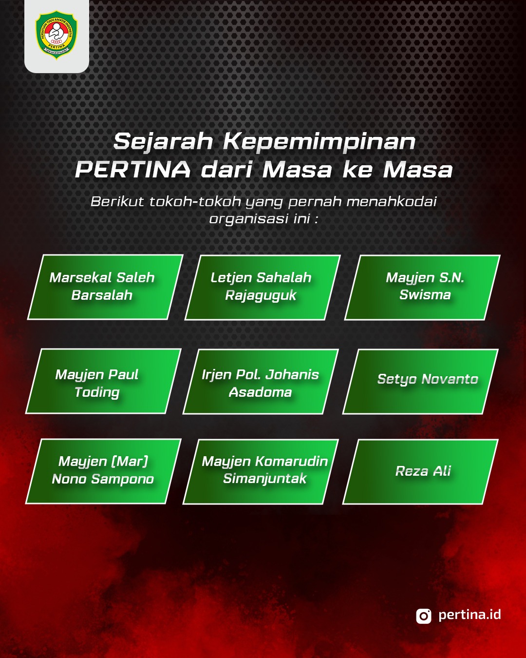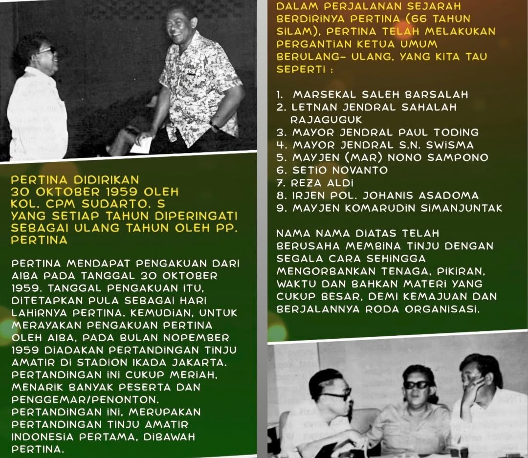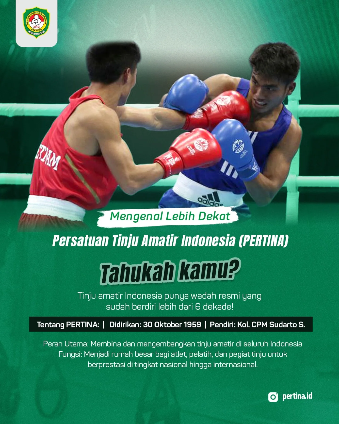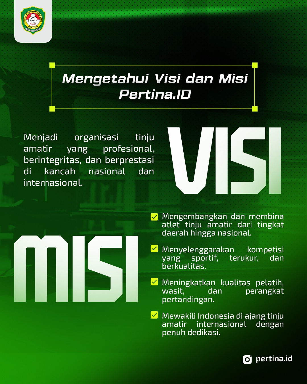 Lahir dari semangat persatuan dan kecintaan terhadap olahraga tinju, PERTINA berkomitmen membentuk atlet berprestasi yang menjunjung tinggi sportivitas, disiplin, dan integritas. Sejak awal berdirinya, PERTINA telah menjadi garda terdepan dalam mencetak petinju-petinju tangguh yang mengharumkan nama bangsa di ajang olahraga dunia.