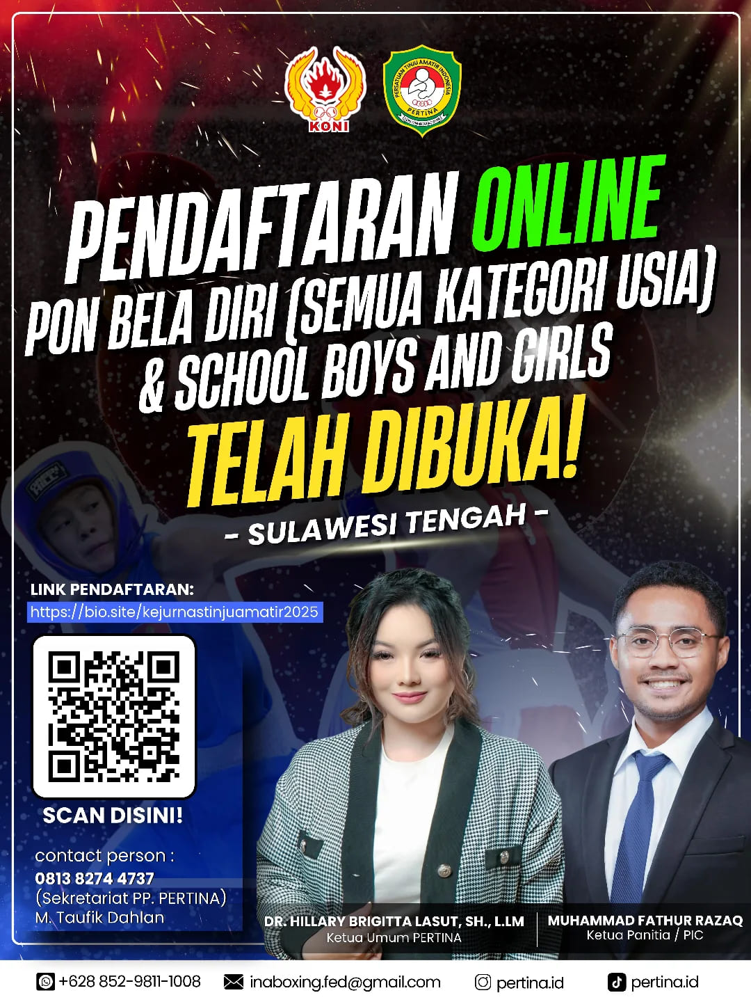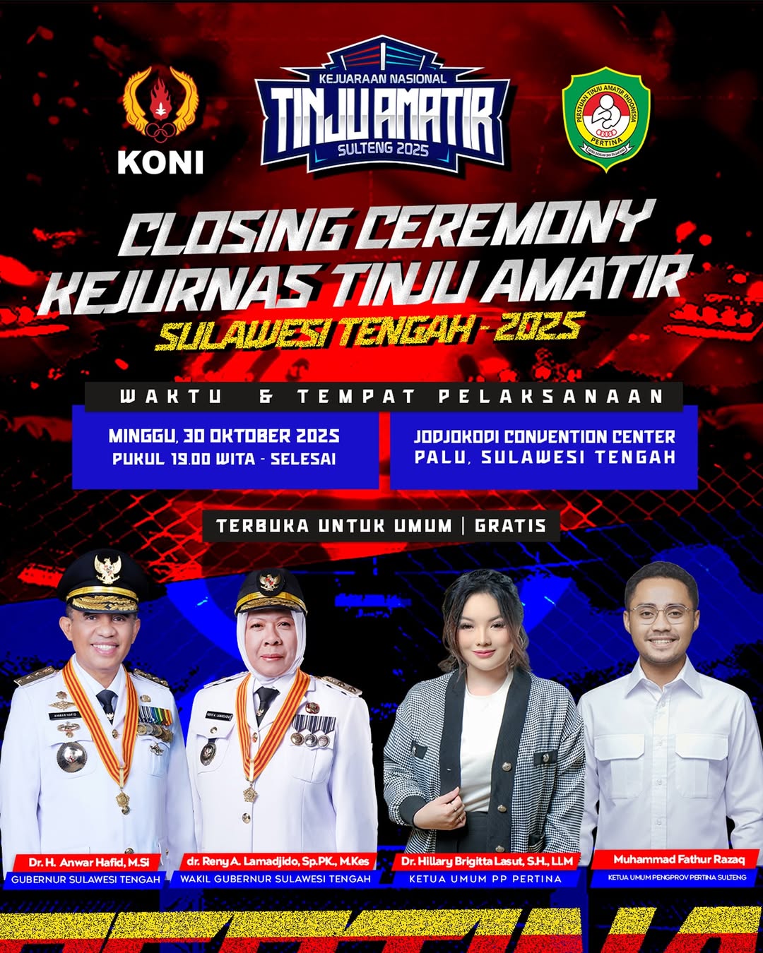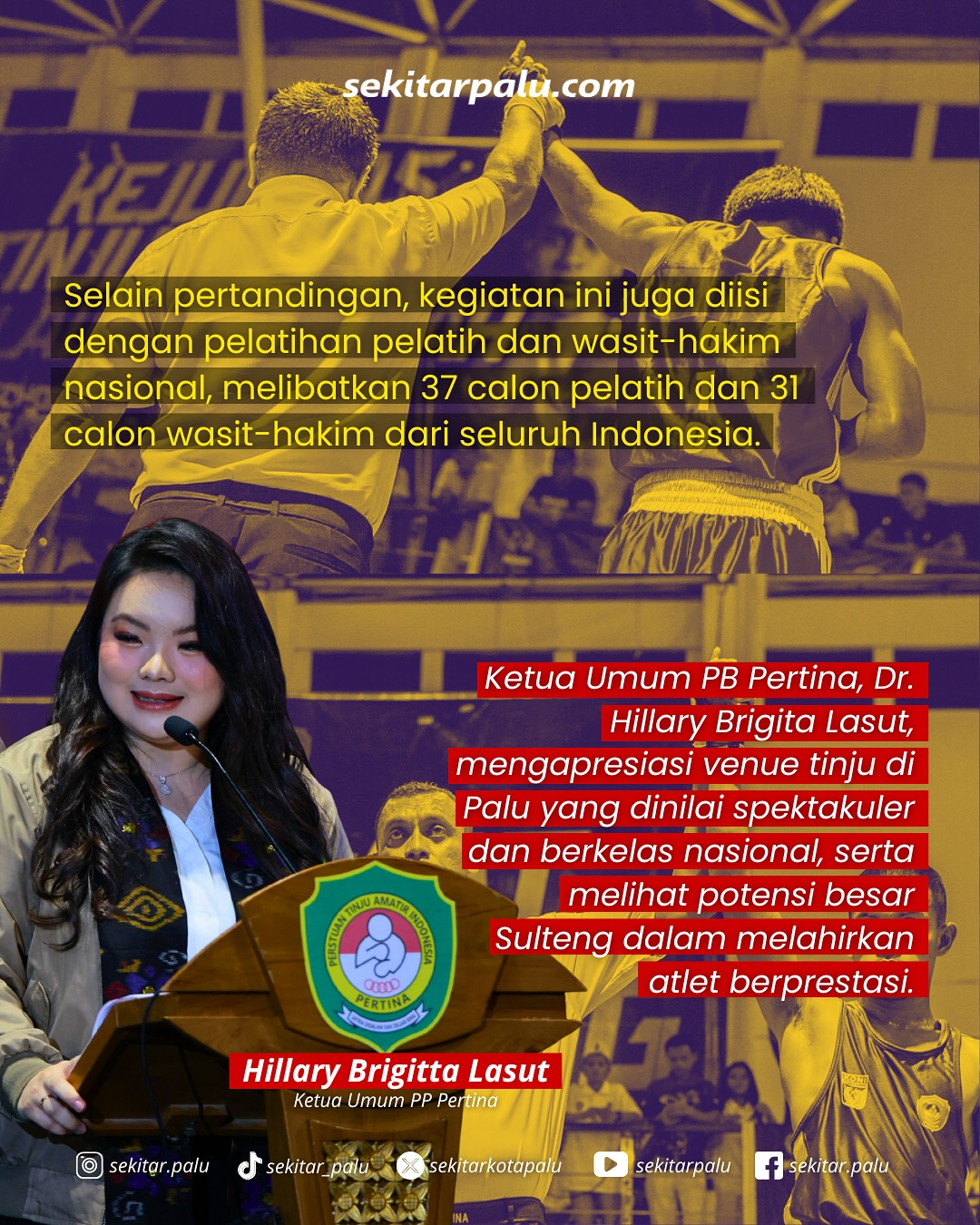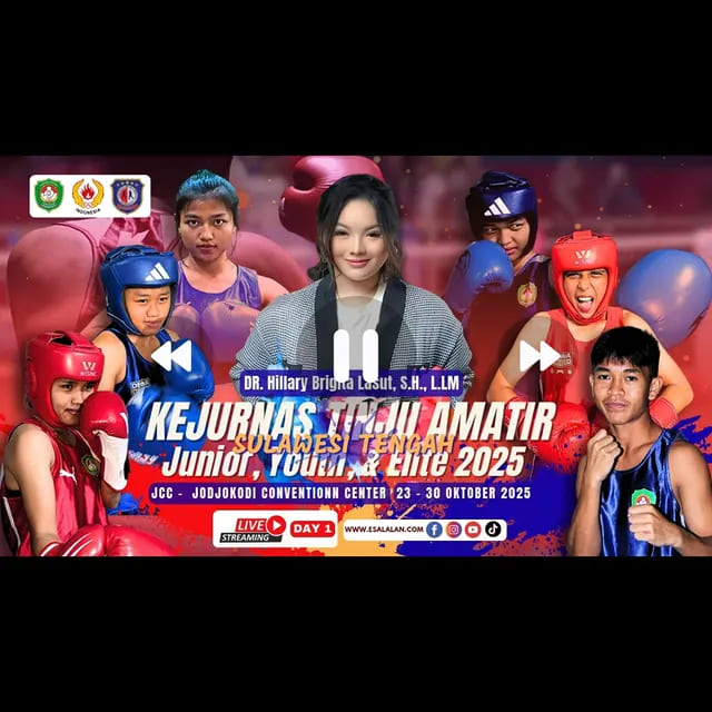 PALU,netiz.id — Ketua Umum Pengurus Pusat (PP) Pertina, Dr. Hillary Brigitta Lasut, S.H., LLM, menyatakan Sulawesi Tengah layak menjadi contoh penyelenggaraan kejuaraan tinju amatir berkelas nasional. Pujian itu ia sampaikan pada pembukaan Kejuaraan Nasional (Kejurnas) Tinju Amatir 2025 di Jodjokodi Convention Center (JCC) Palu, Sabtu malam (25/10/25).