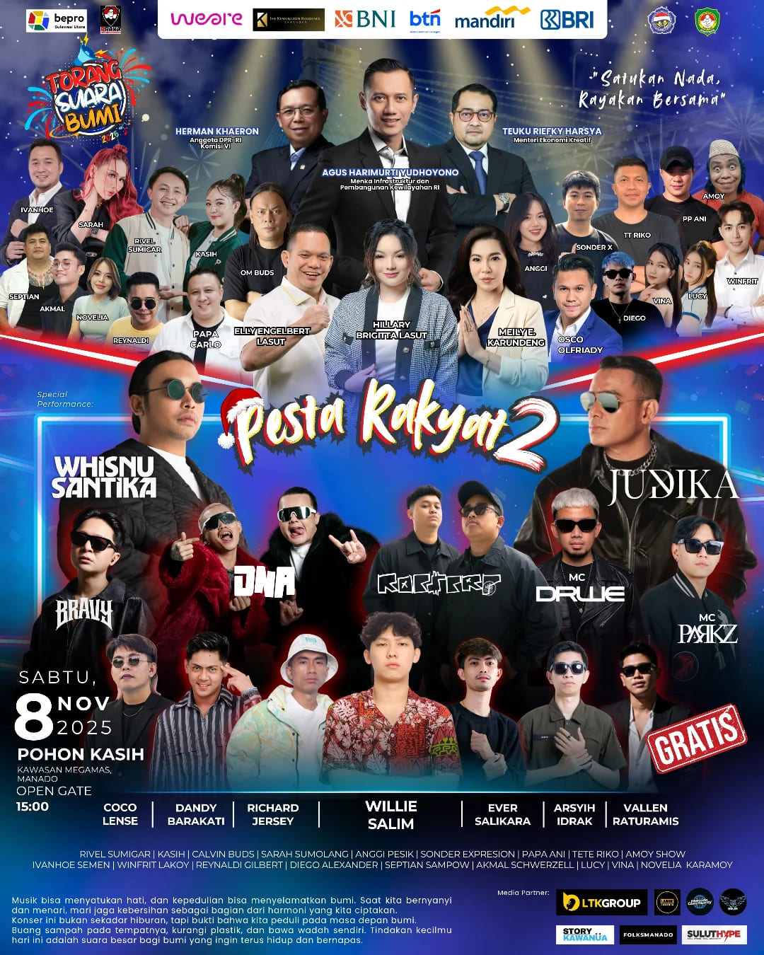 Jakarta: Menteri Koordinator (Menko) Bidang Infrastruktur dan Pembangunan Kewilayahan, Agus Harimurti Yudhoyono (AHY), menghadiri Pesta Rakyat 2 Torang Suara Bumi di Kawasan Megamas, Manado, Sulawesi Utara (Sulut), Sabtu, 8 November 2025. Dalam kegiatan tersebut, AHY menegaskan visi pembangunan yang holistik.