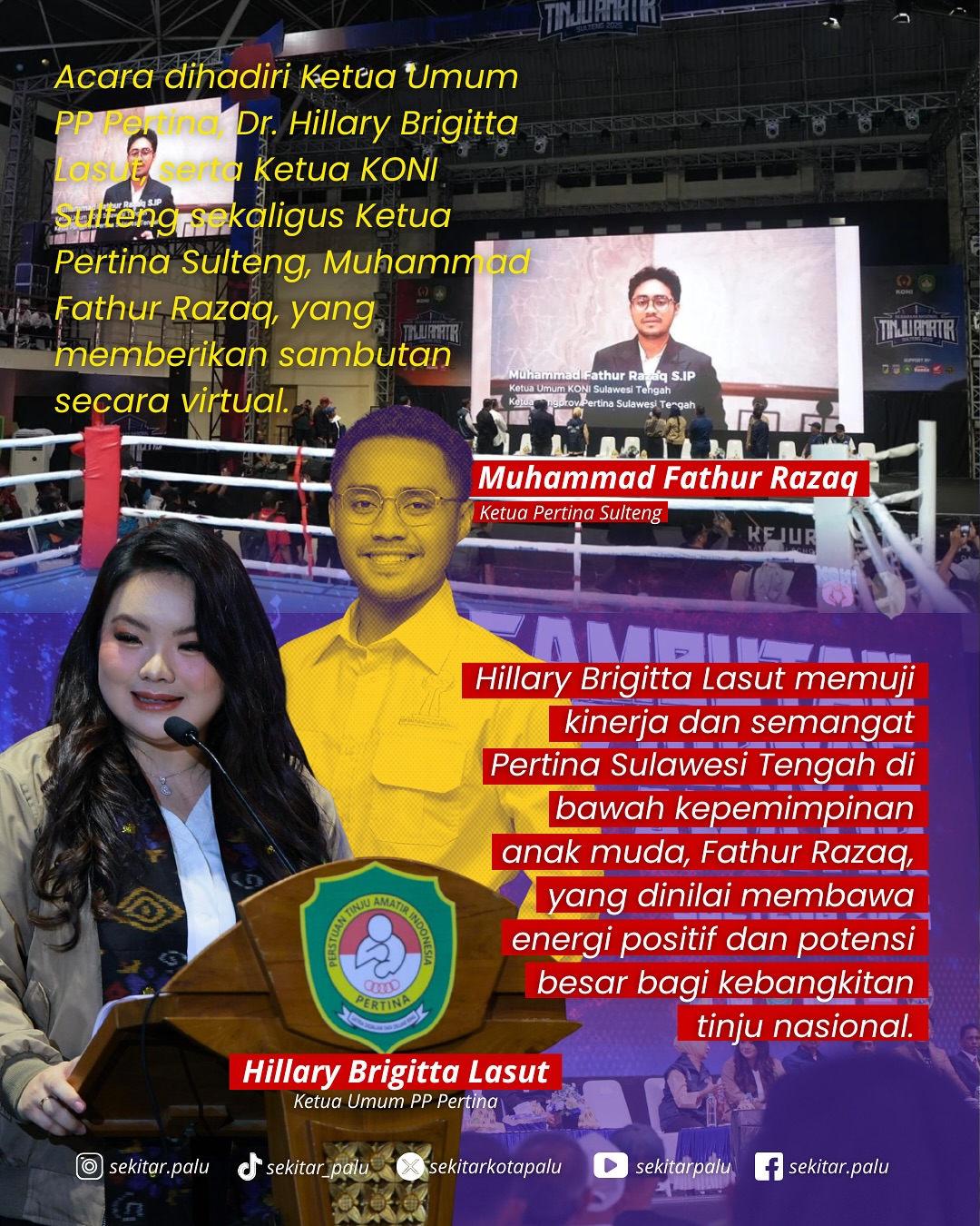 PALU, CS – Ketua Umum Pengurus Pusat (PP) Pertina, Hillary Brigitta Lasut, memberikan pujian terbuka kepada Ketua Pertina Sulawesi Tengah sekaligus Ketua KONI Sulteng, Muhammad Fathur Razaq, atas kepemimpinannya yang dinilai progresif dan inspiratif dalam membangun olahraga tinju nasional.