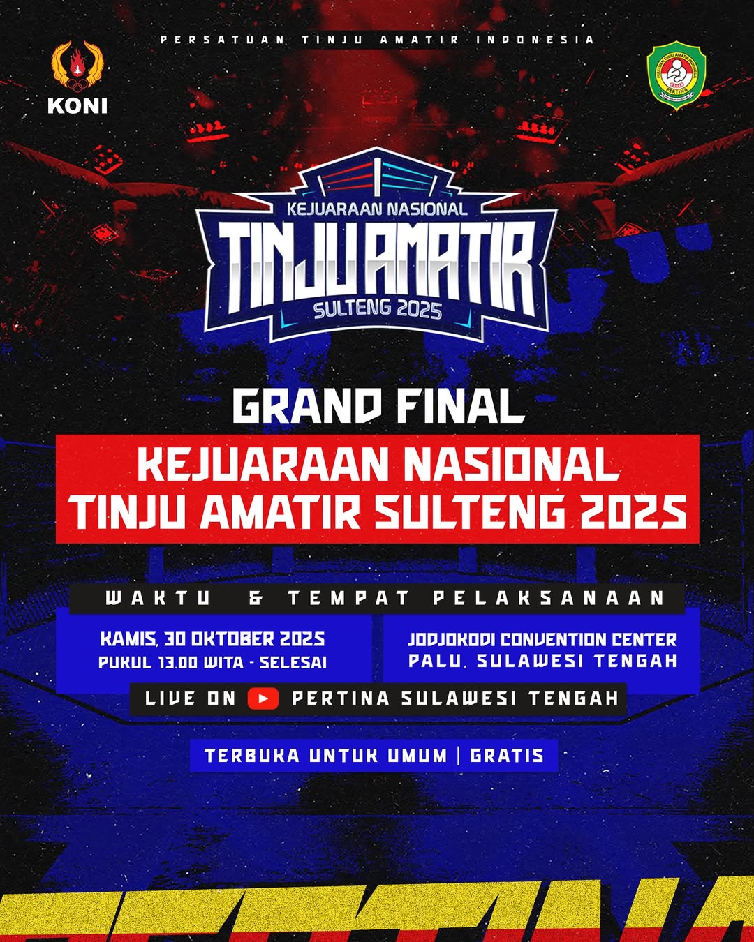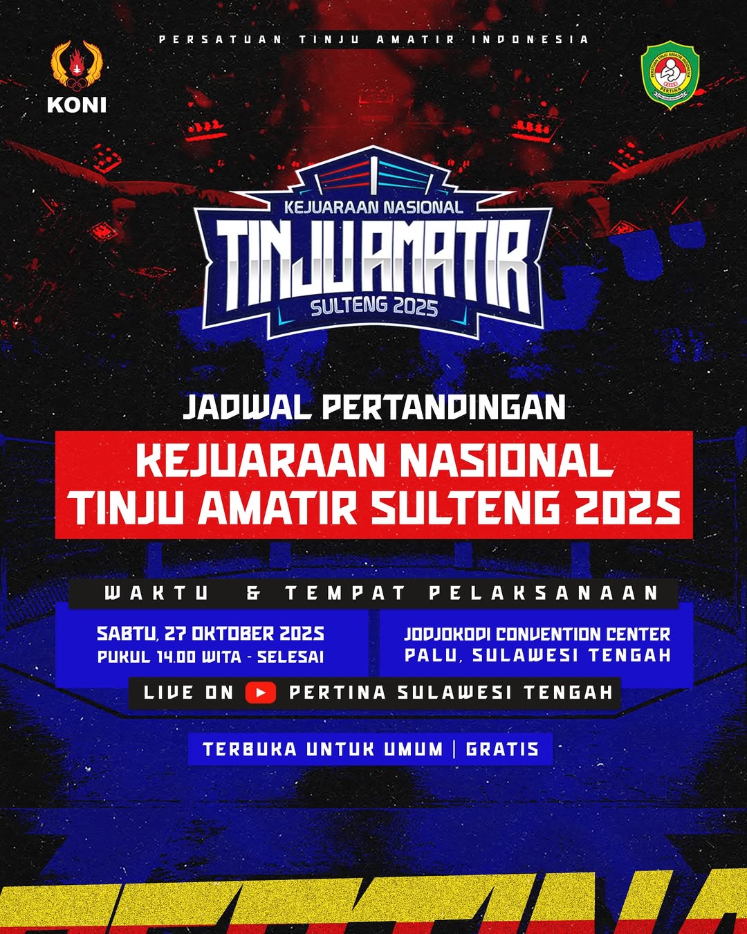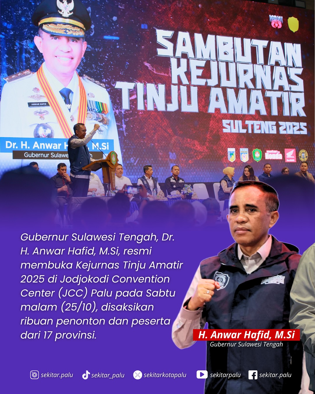 PALU – Acara Opening Ceremony Kejuaraan Nasional (Kejurnas) Tinju Amatir resmi dibuka oleh Gubernur Sulawesi Tengah, Anwar Hafid, di Jodjokodi Convention Center (JCC), Jl Prof Moh Yamin, Kecamatan Palu Selatan, Kota Palu, pada Sabtu (25/10/2025) malam. Acara ini menjadi momen penting dalam rangkaian kegiatan olahraga nasional yang digelar di kota Palu.