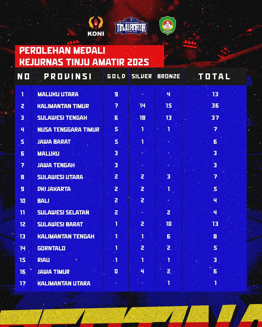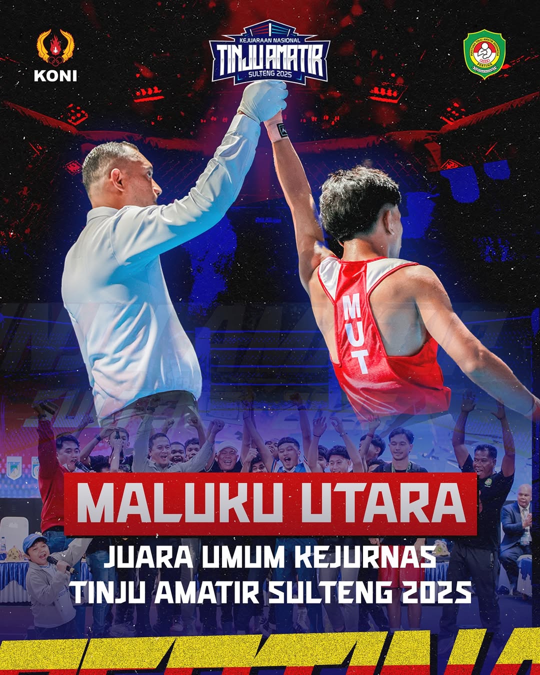 KBRN, Ternate: Prestasi gemilang berhasil ditorehkan atlet tinju Maluku Utara pada Kejuaraan Nasional (Kejurnas) Tinju Amatir 2025 di Sulawesi Tengah. Kejurnas ini berlangsung di Djojokodi Convention Centre, Kota Palu pada tanggal 23-30 Oktober 2025.